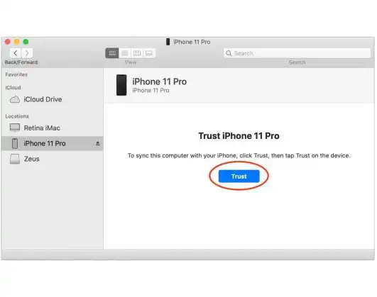 If you are connecting your iPhone with your Mac for the first time, then in Finder when you click on the iPhone from the left sidebar you will see a question that asks you this iPhone on your Mac device. Just click on Trush Button.
