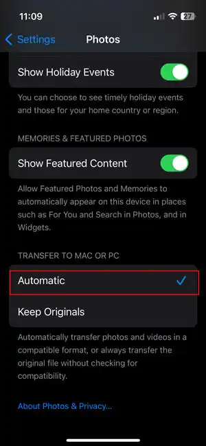 After selecting the Automatic option, you can save space on your device with HEIC but automatically convert images to JPG when you transfer them to your computer.