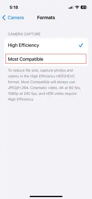 - After that, you will see two formats, i.e. High Efficiency and Most Compatible. Select Most Compatible to save the photos in JPG format.