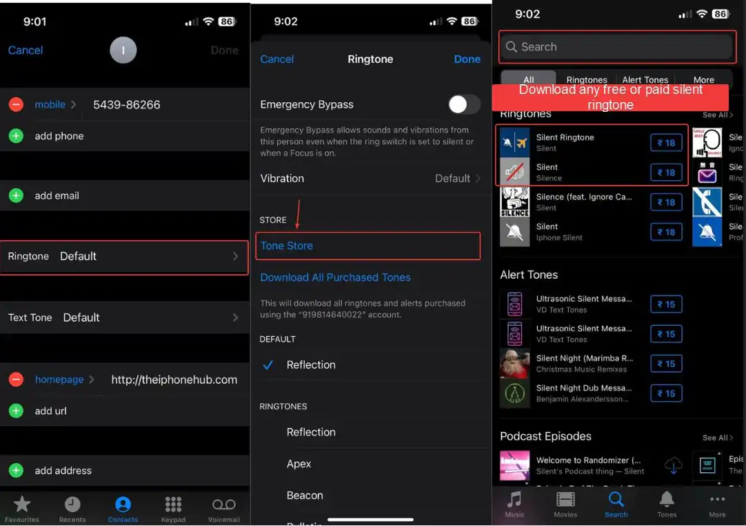 - Tap on “Ringtone” and select a silent ringtone, either by purchasing one from the Tone Store or creating your own.